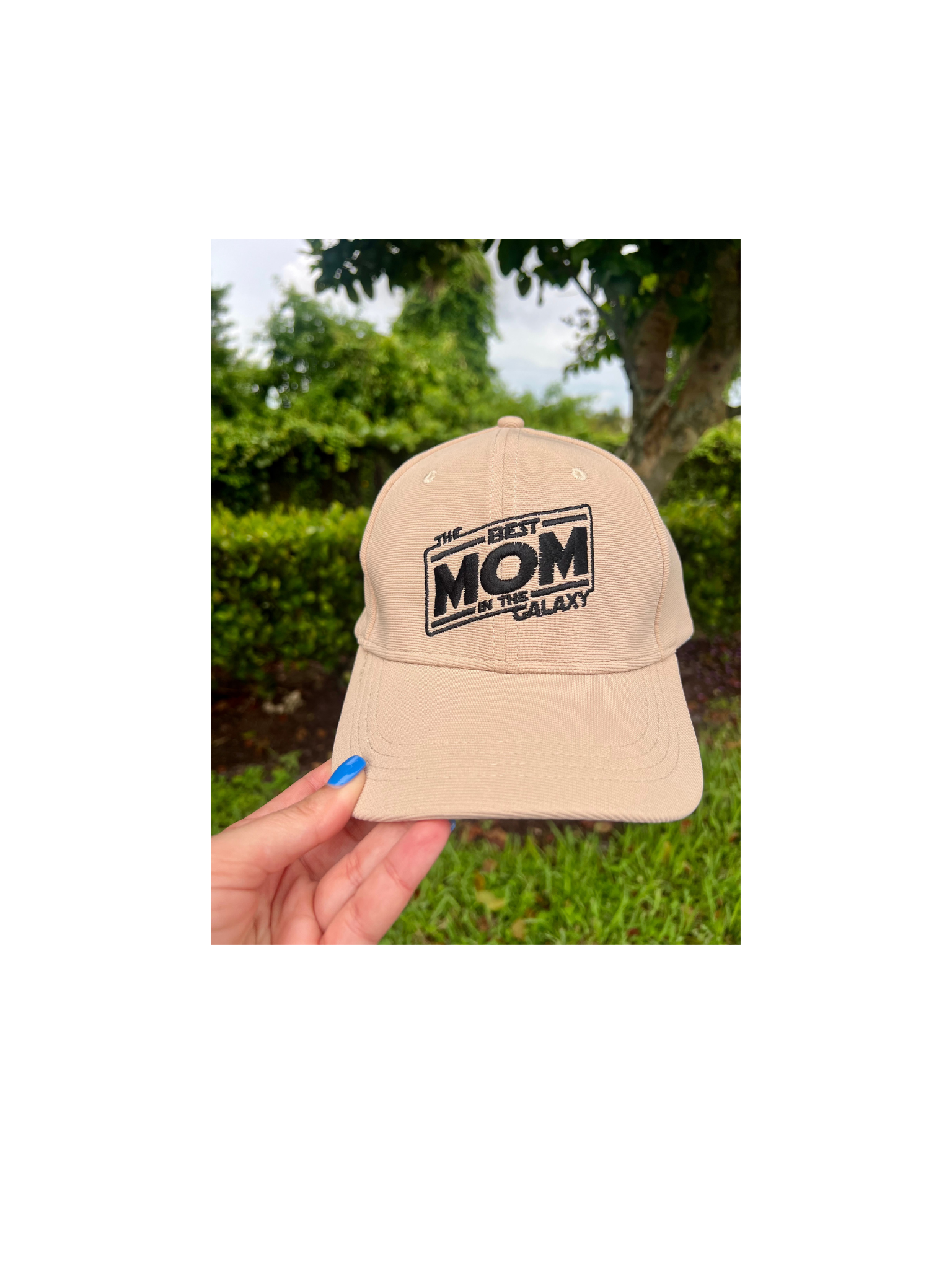 The perfect park essential for the parks for any time of year. Neutral Tan structured baseball cap with a bold Best Dad in the Galaxy or Best Mom in the Galaxy embroidery in black.